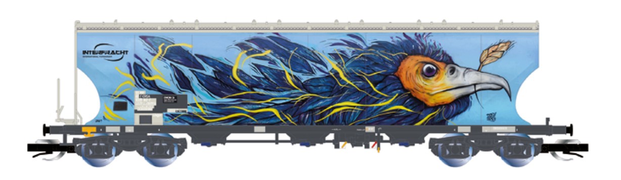 HN9775 F-ERSA – čtyřnápravový obilný silo vůz s kulatými bočními stěnami „Interfracht“, s motivem Vogel-Graffiti.
