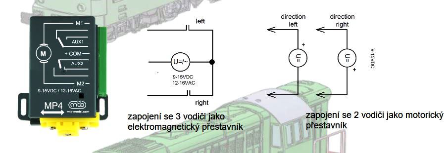 Zapojení přestavníku MP4 je univerzální - třívodicové (jako elektromagnety) nebo dvouvodičové (motorické přestavníky), lze tedy snadno nahradit původní typy bez změny elektroinstalace kolejiště. Kompatibilní s bežnými DCC dekodéry např. Lenz LS100, LS150 i dekodéry pro motorické přestavníky. Pro doplňkové použití je přestavník vybaven dvěma přepínacími kontakty s kapacitou 1A. Koncové spínače zajištují dojezd do polohy i po obnovení přerušeného napájení.