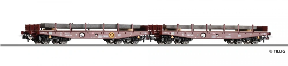 Souprava nákladních vozů DB AG, sestávající ze dvou těžkotonážních vozů Rmms 662, naložených ocelovými bramami