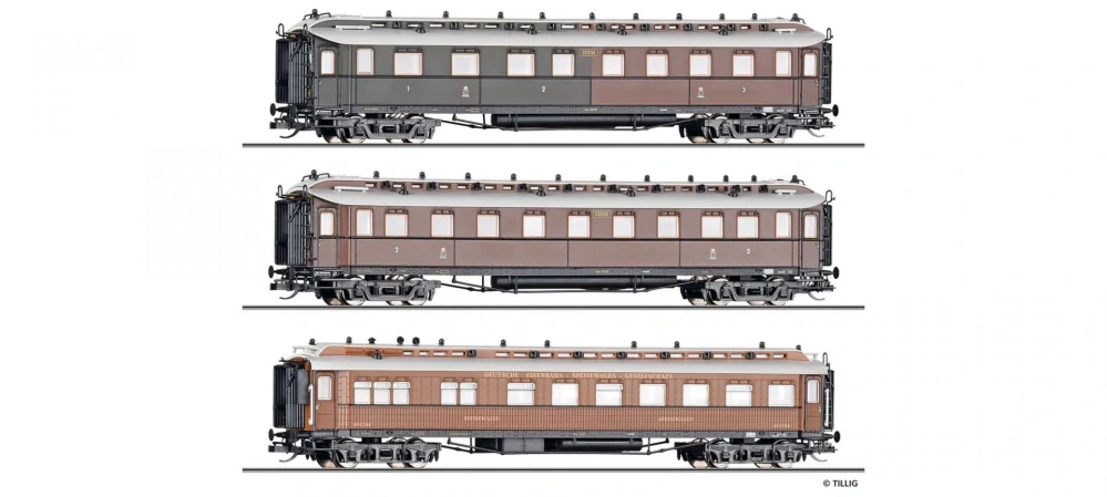 Souprava osobních železničních vozů „Pruský rychlík“ K.P.E.V., sestávající z jednoho osobního vozu 1./2./3. třídy, jednoho osobního vozu 3. třídy a jednoho jídelního vozu, část 2