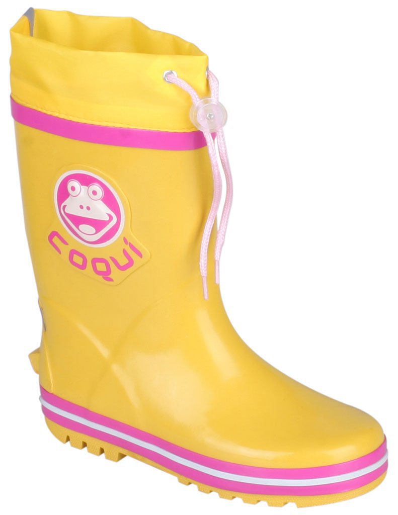 Dětské gumáky Coqui v novém designu, které se skvěle hodí na vycházky do přírody i do města. Díky stahovací šňůrce do holínek nepronikne voda ani při velkém lijáku. Po stranách mají vystouplé logo žabičky Coqui. Nad patou je umístěn reflexní pásek a také gumový výstupek, který usnadní dětem vyzouvání. Holínky Coqui si vaše dítě zamiluje a využijete je na tábory, školy v přírodě nebo na procházky po lese.
